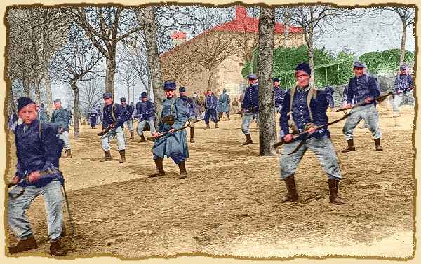 Avant le départ vers le front, linstruction des nouvelles recrues des 9ème et 49ème bataillons de chasseurs à pied est dispensée à Rochechouart : Marches interminables sac sur le dos, discipline, théorie et exercices de combat à la baîonnette sur lancienne place du champ de foire, près du château. |