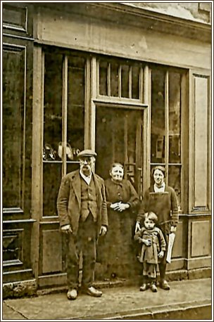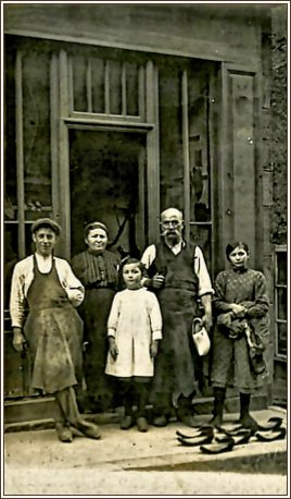 Simon et Maria Boissout, posent avec leurs enfants devant la saboterie qui sera remplacée quelques années plus tard par le magasin Sorton. |