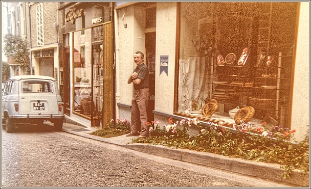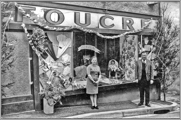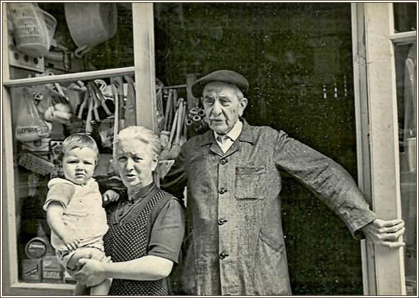 Suzanne et Maurice Sorton accompagnés de leur petit neveu devant leur magasin au mois daoût 1961. |