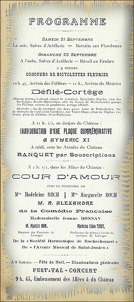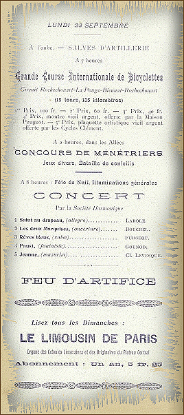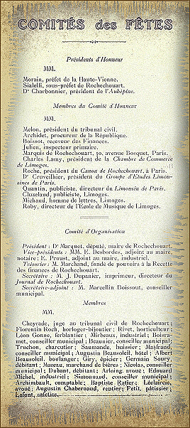 Le programme des festivités qui vont durer trois jours est présenté par le Journal de Rochechouart en Septembre 1912 :