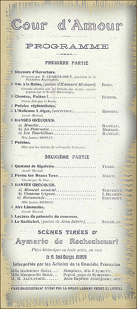 - 14 heures 30, Cour dAmour dans les allées du château avec le concours de Mlles ROCH Madeleine et Marguerite et M. ALEXANDRE de la Comédie Française.