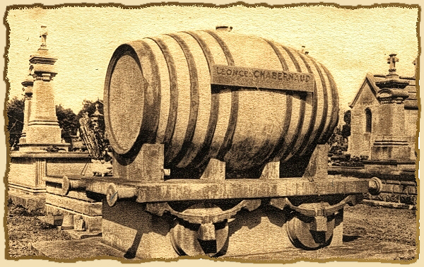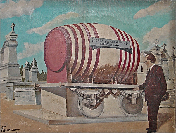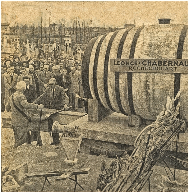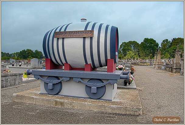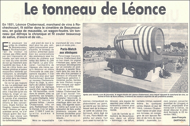 Et puis, un jour, ce fut dans Rochechouart comme un immense éclat de rire. Léonce Chabernaud avait fait édifier, en guise de mausolée, un wagon-foudre de cent hectolitres, scrupuleusement reconstitué, avec sa plate-forme, ses tampons, ses roues et le rail. À grands coups de pinceau, les peintres badigeonnèrent le cénotaphe de rouge, les cercles de noir et inscrivirent en guise dépitaphe, en grosses lettres, comme il se doit pour stimuler la réclame : Léonce Chabernaud, vins en gros, Rochechouart (Haute-Vienne).
