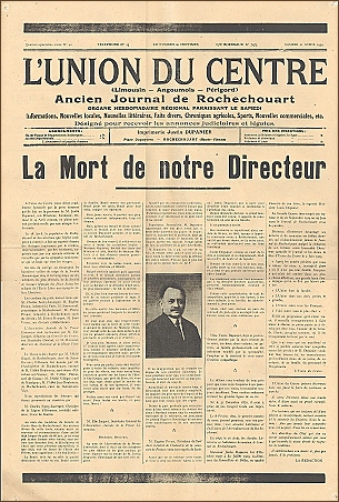 La une de LUnion du Centre, le samedi 21 avril 1934, annonçant le décès du directeur du journal