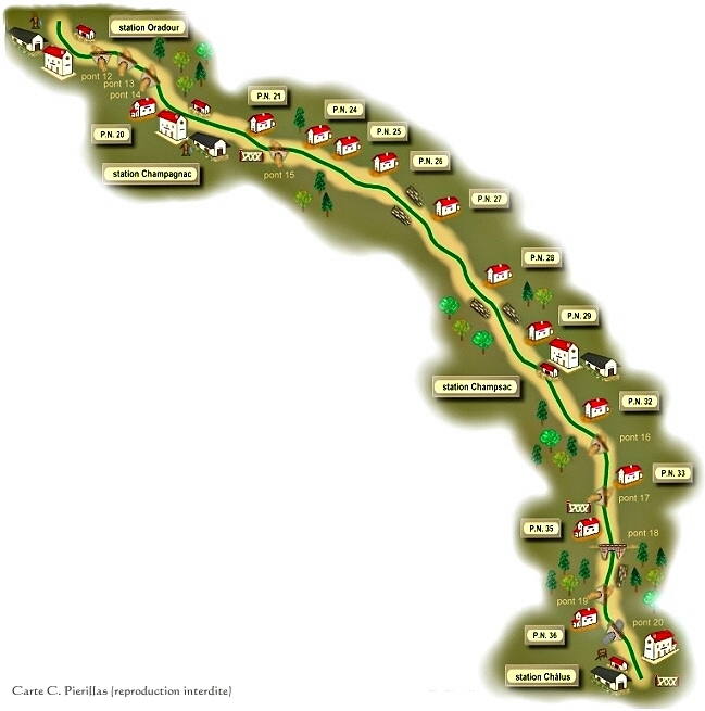Que soient vivement remerciés, tous ceux, qui, refusant les exigences du lobby de lautomobile, faisant rempart à lirrésistible besoin de détruire de certains, ont sauvegardé cette portion de voie de chemin de fer désaffectée, cette coulée verte, qui conduit le promeneur, en pleine nature, de lancienne gare dOradour-sur-Vayres à celle de Châlus. |
