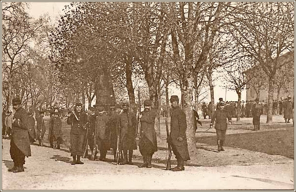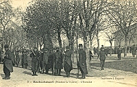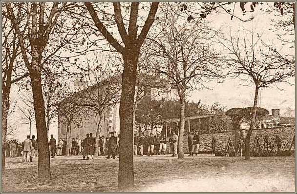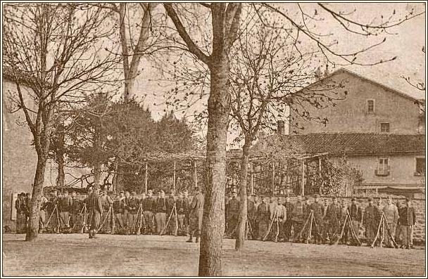 Avant le départ vers le front, linstruction des nouvelles recrues des 9ème et 49ème bataillons de chasseurs à pied est dispensée à Rochechouart : Marches interminables sac sur le dos, discipline, théorie et exercices de combat à la baîonnette sur lancienne place du champ de foire, près du château. |