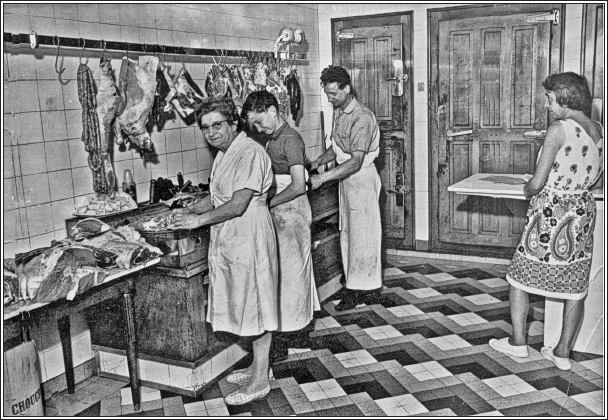 Dans sa boucherie, Jeannot Tuffet, sa mère et son commis, saffairent pour servir une cliente. |