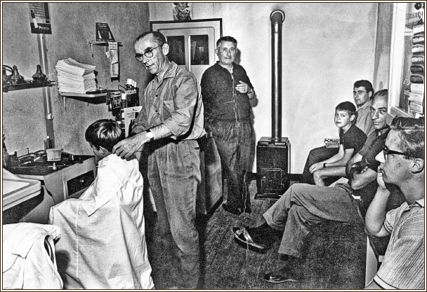 En haut de la rue, de nombreux clients sont réunis dans le magasin de coiffure hommes de M. Maruteaux. Le système des rendez-vous nétait pas encore pratiqué à cette époque. Chacun attendait son tour, et, les jours daffluence, celà pouvait durer longtemps ! |