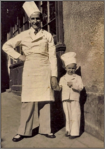 Suzanne et Maurice Sorton accompagnés de leur petit neveu devant leur magasin au mois daoût 1961. |