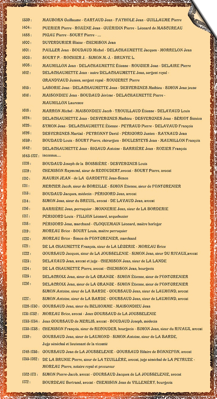 Les consuls furent supprimés en 1772. La nouvelle municipalité se composera à partir de cette date de deux échevins, trois conseillers de ville, un syndic receveur et un secrétaire greffier.